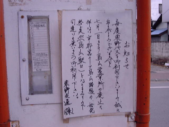 烏山駅前のバス停に貼ってあった東野交通烏山営業所の廃止に伴う路線バスの始発・終点のお知らせ。